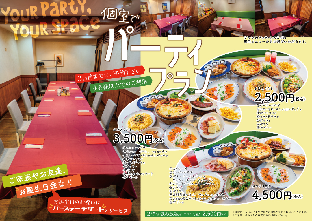 | パーティプラン承ります | 複数名でご利用いただけるグループ向けパーティプランをご用意しております。ピッツァとパスタにオードブルとメインディッシュ、デザートをセットし、2時間飲み放題もセット可能です。お友達やご家族でもぜひご利用下さい。 |