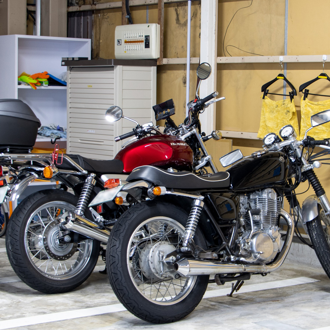 ライダーの皆様に安心してご宿泊いただく為のバイクガレージがございます。シャッター付きの全天候型で雨風をしのぎ、メンテナンス工具・洗車道具 + ガレージ内に水道も完備しております。