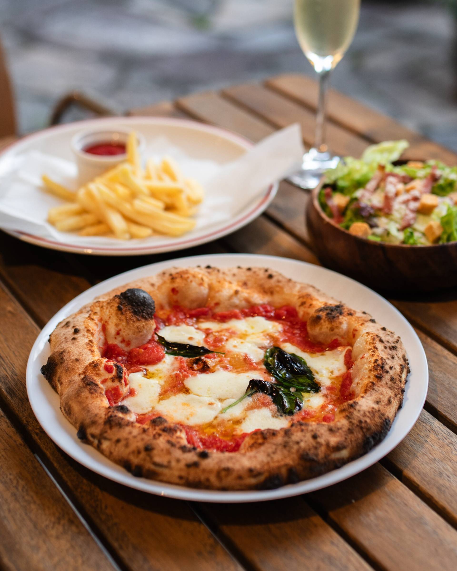 本場の薪窯で焼き上げた本格ナポリピッツァをはじめ、前菜やパスタ、お肉・お魚料理にデザートに、厳選したワインやカクテルもご用意しております。営業中はピッツァのテイクアウトも対応しております。