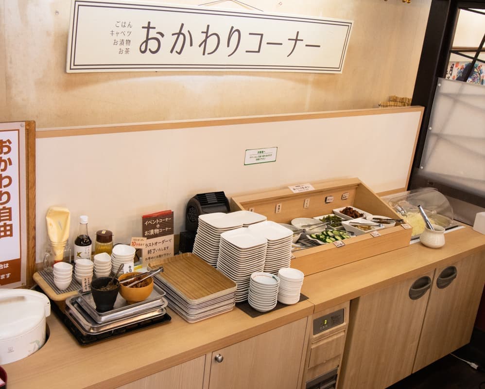 お持帰りいただけるのはご注文いただいたお料理のみで、おかわりコーナーのお漬物やごはん、汁物、キャベツ、デザート、お飲み物などは不可とさせていただきます。また、海鮮系の商品につきましては一部お持帰りいただけません。